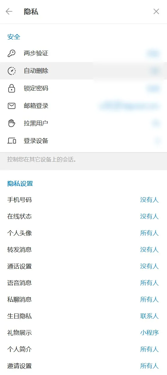 - 在线状态没什么必要设置,你即使是设置成别人看不见,但是对方如果是电报会员,你的设置是无效的。