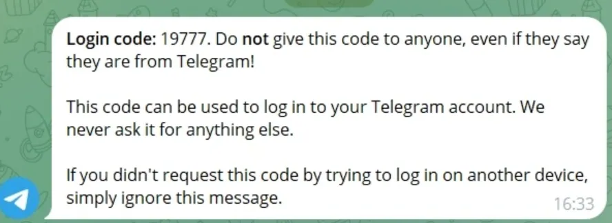 推送方式:应用内验证码通过Telegram app以通知形式发送至已登录设备,显示在聊天界面。