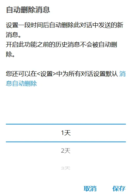 - 挑选时间间隔:从列表中选择合适的时长,如1天、1周或自定义。确认后,设置立即生效,新消息将自动计时删除。